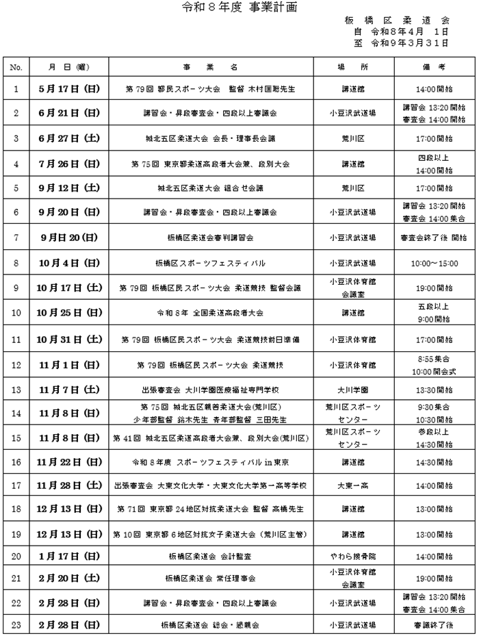 新型コロナウィルス感染症について ・新型コロナウィルス感染症対策ガイドライン ・全日本柔道連盟段階的練習・試合再開の状況と内容 ・板橋区柔道会昇段審査会当日提出用紙 令和8年度 事業計画